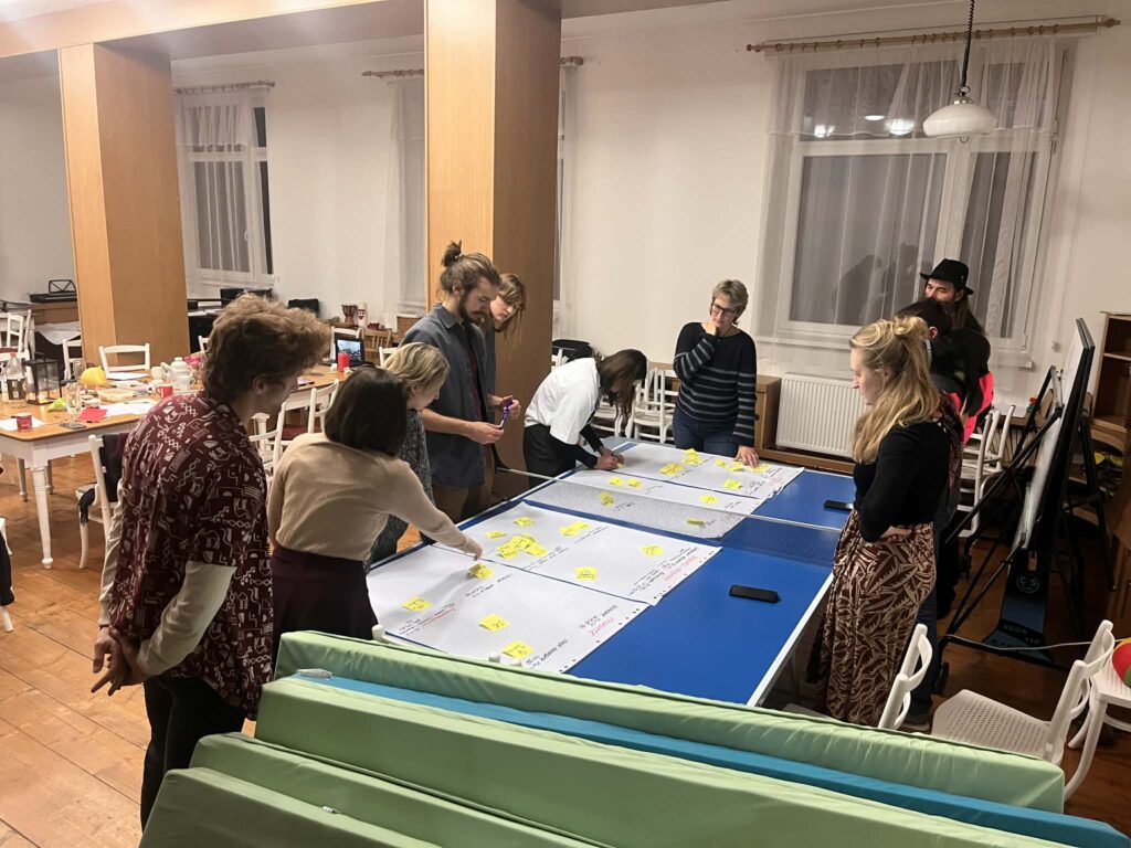 Páteční večer trochu připomínal party. Nejprve bylo potřeba se navzájem seznámit a začlenit nové jedince. Vzduchem létaly zajímavosti o všech členech, stavělo se sousoší, ukázalo se, kdo rád zatlouká hřebíky, kdo umí chodit o berlích a kdo byl poprvé na sjezdu před 10 lety právě v Třebíči. Tohle všechno zpískali Vašek a Sára v seznamovacích hrách. Rozdělování rolí při přípravách sjezdu a na sjezdu chvílemi připomínalo více aukci než party. Ale flipcharty se postupně plnily našimi jmény, rolemi, úkoly, termíny. Po krátkém ztišení s místní farářkou Martinou Zuštinovou se party vibe vrátil při výběru sjezdových kapel. Farou burácelo nemálo nástrojů, aranžmá, hlasů, stylů, ale i argumentů pro a proti. Které z interpretů na sjezdu nakonec uslyšíte, si zatím necháme pro sebe.