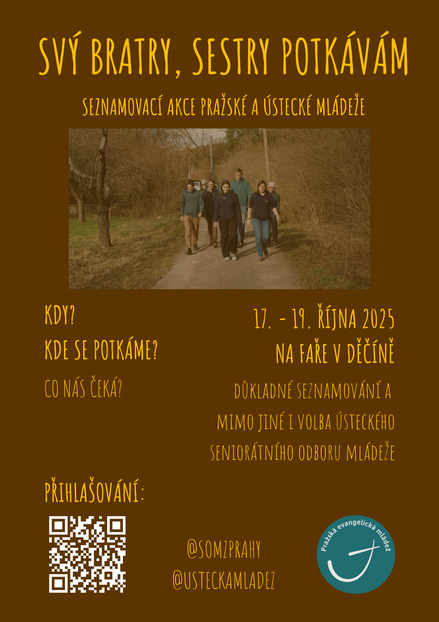 Pražská mládež Českobratrská církev evangelická Plánované akce seznamovačka Ústí 17. až 19. říjen 2025 ČCE Děčín Podzimní dny mládeže s volbou SOMu 21. až 23. listopad 2025 Pubkvíz 08. prosinec 2025 Bajbál 09. leden 2026 KD Barikádníků * Události označené jsou celocírkevní události, na které jste srdečně zváni. Všechny plánované akce naleznete zde