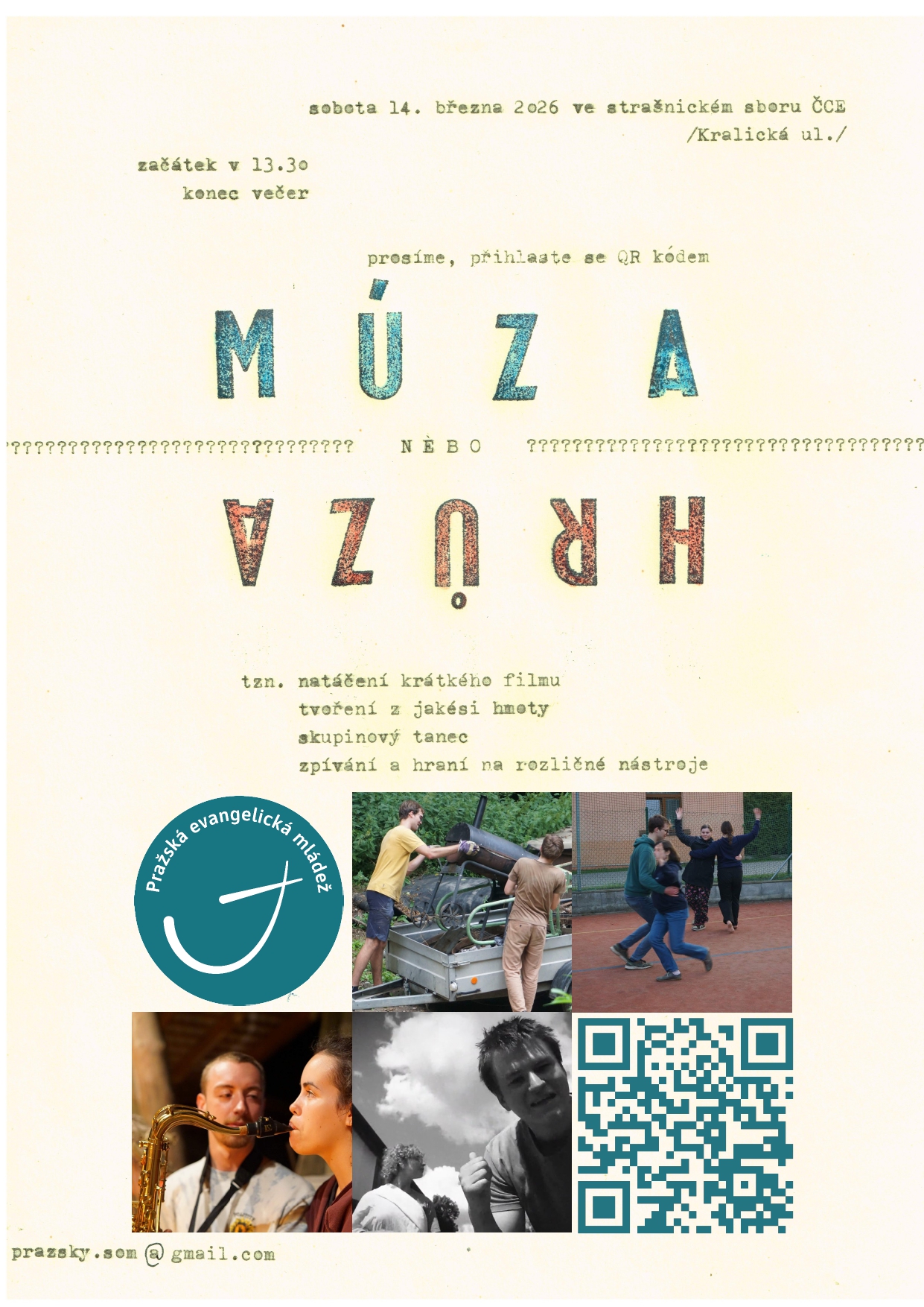 Pražská mládež Českobratrská církev evangelická Plánované akce Múza, nebo hrůza 14. březen 2026 ČCE Strašnice Akce pro konfirmandy 11. duben 2026 Libčice nad vltavou Jarní seniorátky 24. až 26. duben 2026 Kappa weekend 01. až 03. květen 2026 Kolem, nebo polem 16. květen 2026 Minipuťák 22. až 24. květen 2026 Grilovačka 19. červen 2026 Letní akce 13. až 19. červenec 2026 Mládežnická voda 20. až 26. červenec 2026 Pecka 2026 26. červenec až 08. srpen 2026 Velký puťák 17. až 23. srpen 2026 Stěna, nebo pěna 04. až 06. září 2026 MapoLesoHra 26. září 2026 Sjezd (nejen) evangelické mládeže 2026 02. až 04. říjen 2026 Třebíč * Události označené jsou celocírkevní události, na které jste srdečně zváni. Všechny plánované akce naleznete zde
